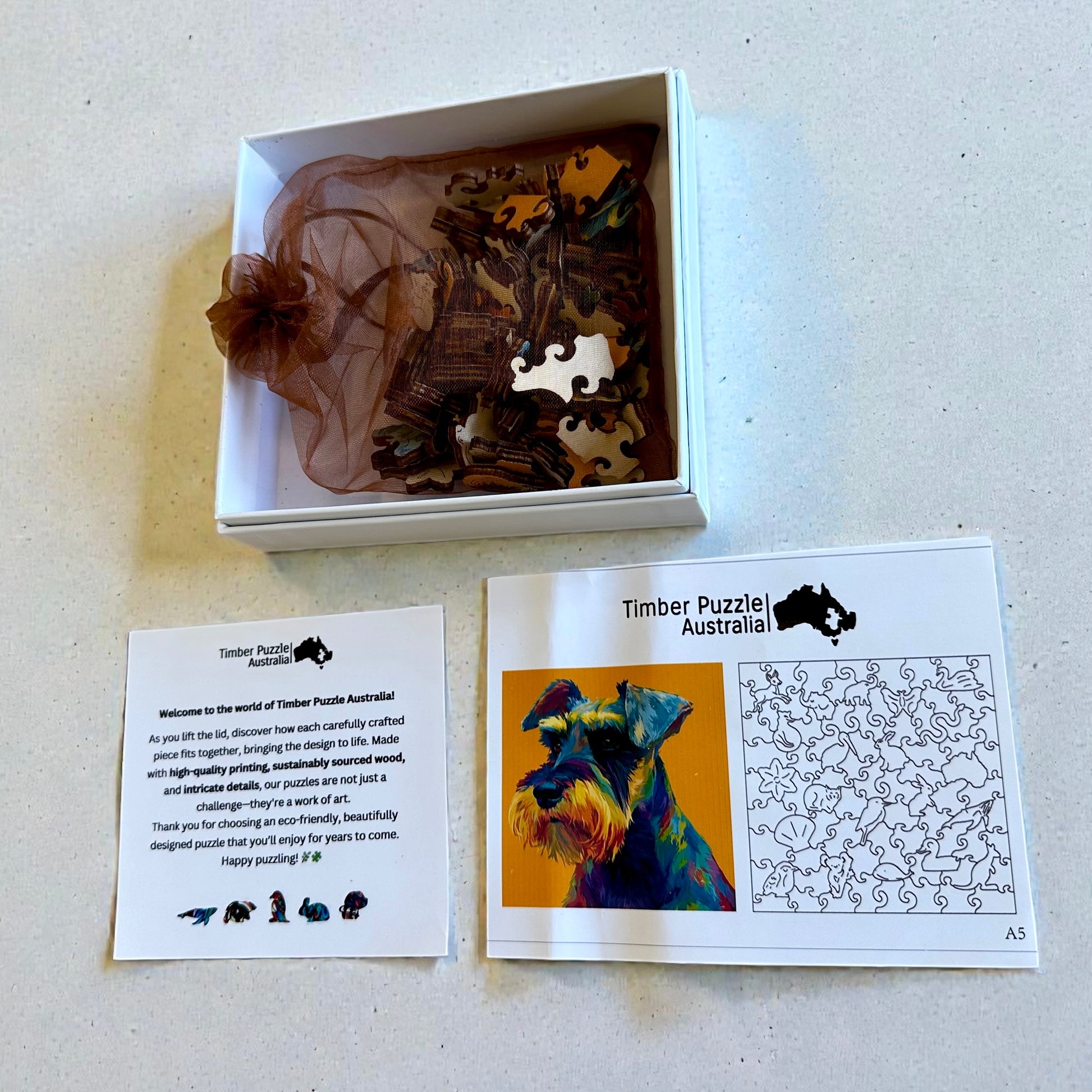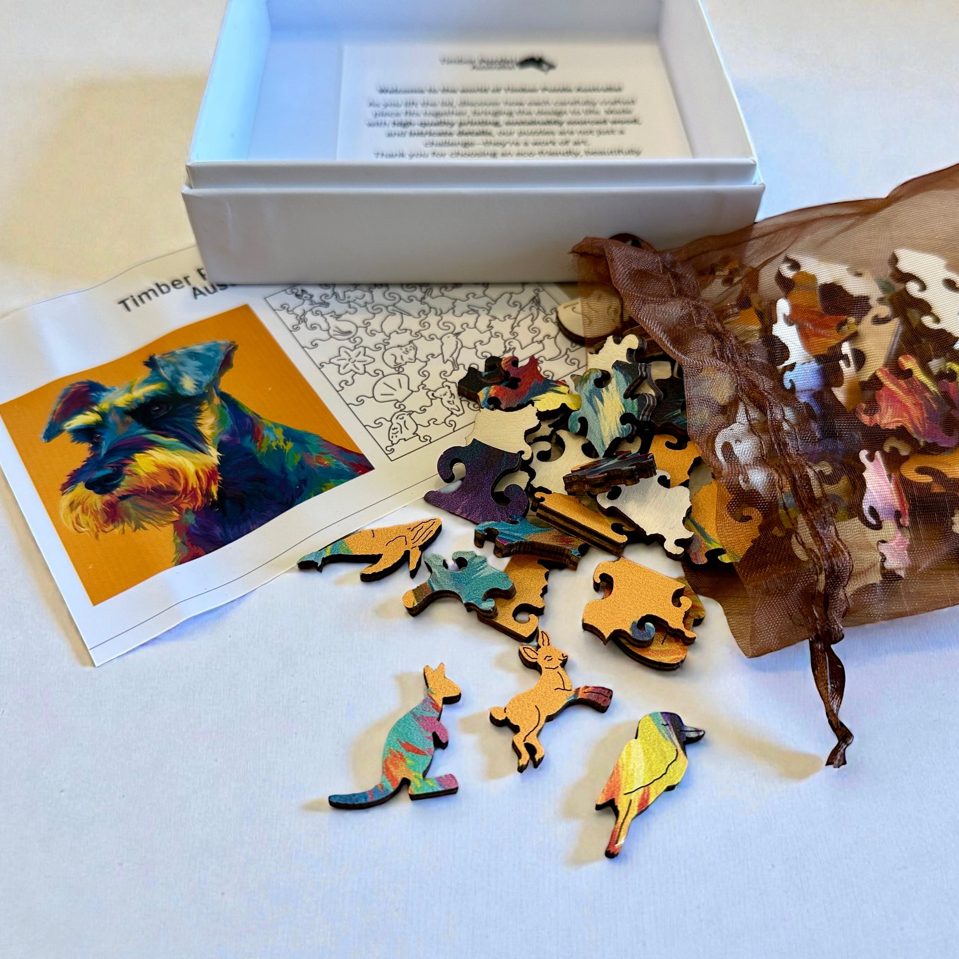 Experience the beauty of Colorful Schnauzer Puzzle, featuring a charming vintage-inspired. Made from eco-friendly materials, this puzzle offers a fun and stimulating brain challenge while serving as a stunning piece of art that can be framed and displayed. Perfect for enhancing cognitive function and adding a touch of nostalgic charm to your home, this puzzle is an ideal choice for both entertainment and decoration.