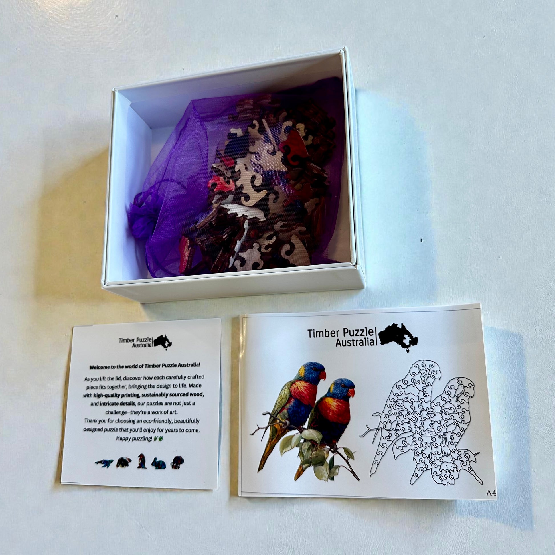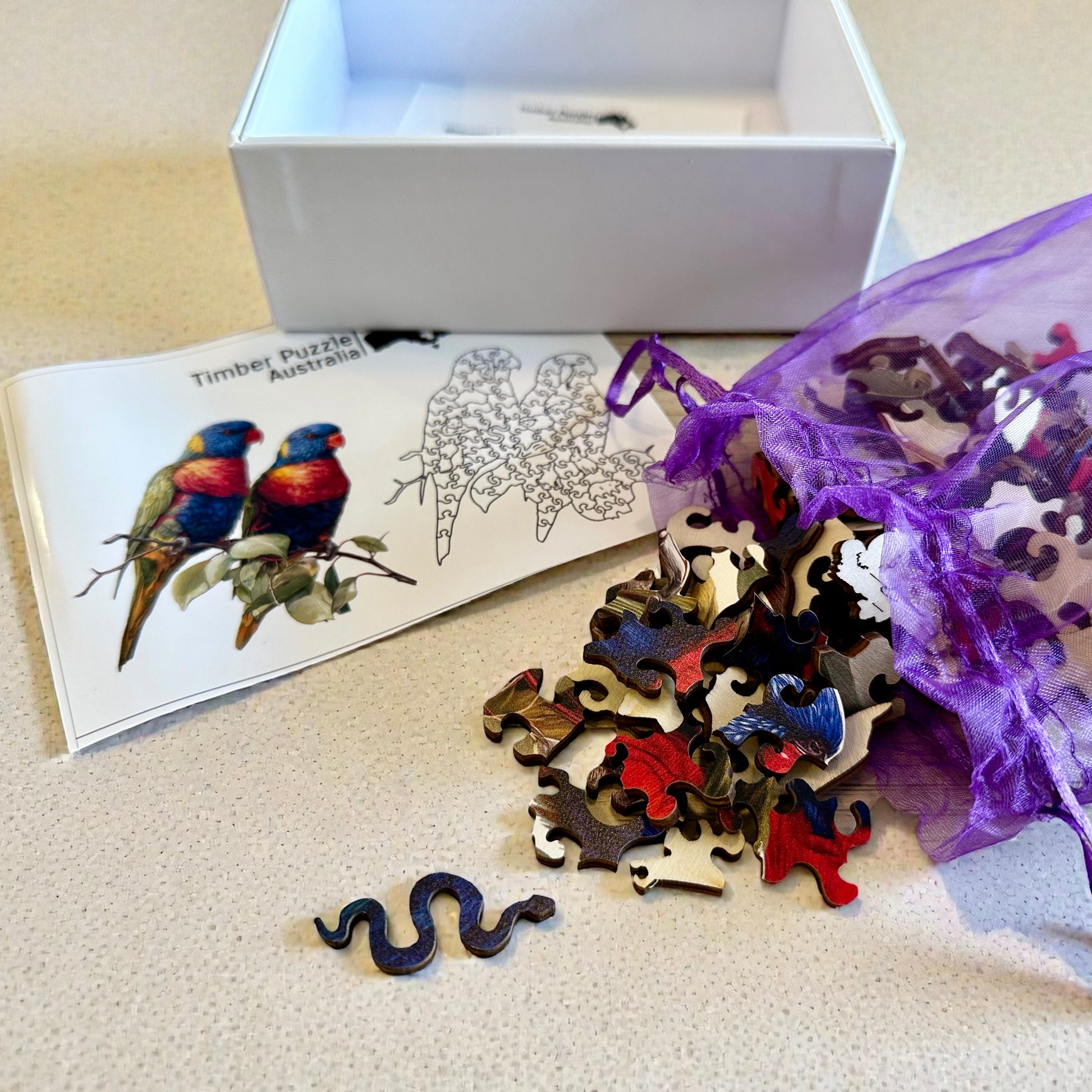 Crafted from sustainable timber, our Rainbow Lorikeets puzzle is a perfect blend of beauty and eco-friendliness. Handcrafted and printed with water-based colors, it offers vibrant yet soft visuals suitable for all ages. Ideal for spending quality time with family, this puzzle also makes a thoughtful and unique gift. It provides entertainment and enhances brain function. Once completed, frame and hang your puzzle on the wall—the vibrant colors will make a stunning display.